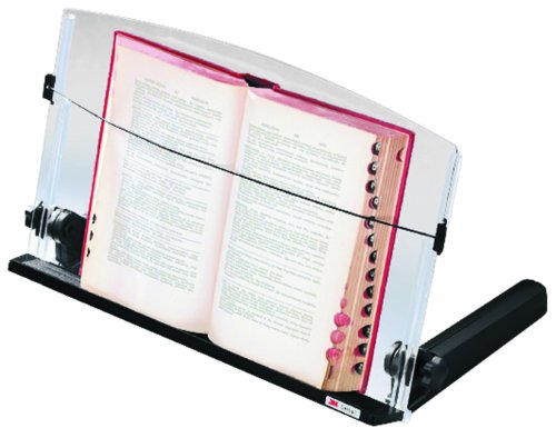 Position in-line between monitor and keyboard. Weighted base allows ledge to dip below desk edge. Elastic line guide marks your place and keeps pages open. 18"-wide backplate supports books, catalogs, and just about any size document. Angle and height adjustable. Sheet capacity: 300 sheets. Contains 40% preconsumer recycled content. 5 year warranty. 3M Copy In-line Copy Holder, 300 Sheet Capacity (DH640)