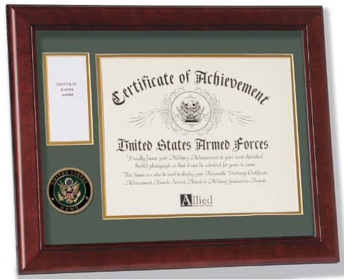 Allied Frame's U.S. Army medal and certificate of achievement frame has a 1-3/4" x 4" medal opening, centered above a United Sates Armed Service Medallion. To the right of the medal opening is an 8" x 10" certificate or award opening. The medal and award openings are bevel-cut into a double layer of matting. The inside layer of matting has an elegant, golden accent. This solid wood, mahogany stained frame is perfect for showcasing any military honors, awards, certificates of achievement or large photographs. Allied Frame United States Army Medal and Award Frame