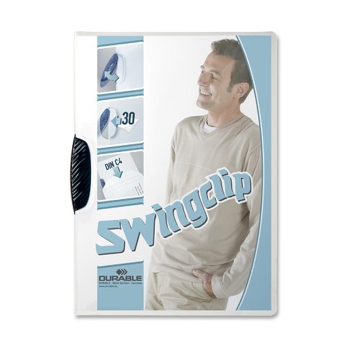 The Swingclip report cover from Durable Office Products features a contemporary design with a stylish molded clip that swings effortlessly to the side for fast addition or removal of pages. This transparent wrap-around clear report cover gives a distinctive professional appearance to documents and holds up to 30 sheets, without no need to punch holes. It is made of thick polypropylene for durability and maximum protection of contents. Each report cover opens flat for easy viewing of the top sheet and the clip operates smoothly and will not damage paper edges. Durable has a long tradition of creating innovative, functional products that contribute to the user's success through performance, excellent design and high-quality materials. Vision and responsibility for a natural environment and a humane society characterize the style of success on which we model our business. This has and always shall be the cornerstone of Durable. Durable Swingclip No-Punch Report Cover, 30 Sheets, Letter Size 8 1/2 x 11 Inches, Clear with Black Clip, Pack of 5 (DBL2264-01)