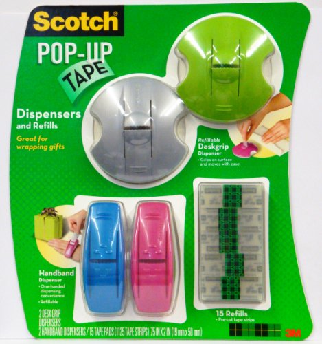 Scotch® Pop-Up Refillable Deskgrip dispenser delivers convenience at your fingertips. Unique soft rubber suction disk grips to most horizontal, smooth surfaces and moves with ease. Scotch® Pop-Up Tape Handband dispenser is the ultimate in tape delivery, style, and convenience. With one-handed dispensing, this attractive and sleek styled dispenser slips comfortably onto your hand. Refill your Scotch® Pop-Up Tape dispensers with these refill pads. Precut lengths of tape .75 in x 2 in, 75 tape strips/pad. The tape disappears on most gift wrap papers. Scotch 3M Pop-Up Tape Set, 2 Desk Grip Dispensers, 2 Handband Dispensers, 15 Tape Refills
